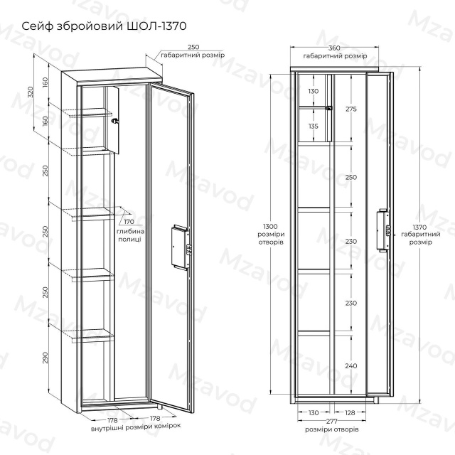 Сейф предназначен для хранения 3 единиц огнестрельного оружия до 1340 мм высотой, патронов и дополнительных аксессуаров.