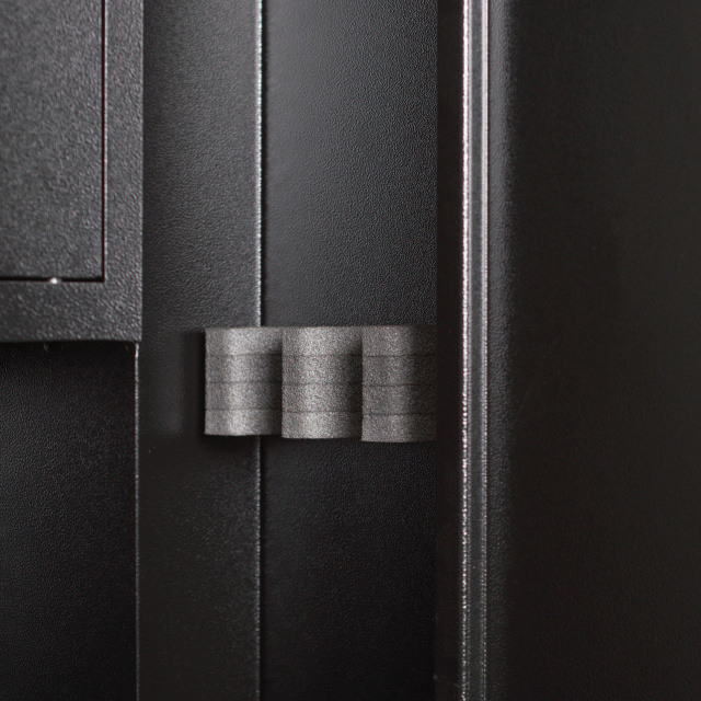 Конструкция корпуса выполнена из листовой стали толщиной 1,2мм корпус, 1,5мм дверная плита и 2,0мм отсек под патроны. Дверное отверстие усилено. Дверь данного сейфа утоплена, что также повышает его надежность.