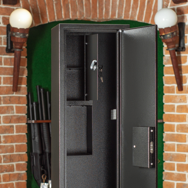 Сейф предназначен для хранения 2 единиц огнестрельного оружия до 970 мм высотой и патронов.