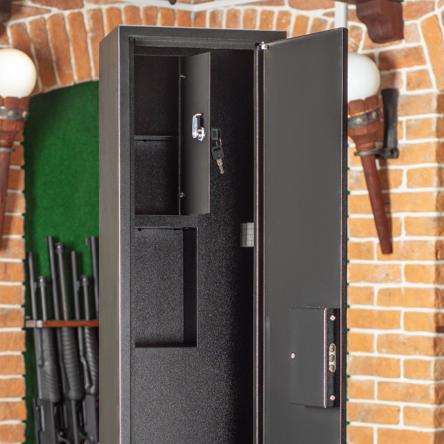 Сейф предназначен для хранения 2 единиц огнестрельного оружия до 1070 мм высотой и патронов.