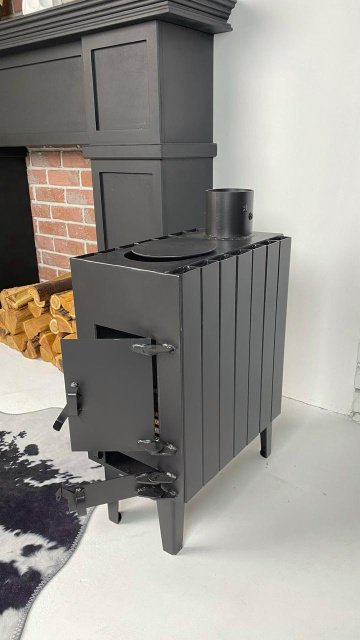 Печь-буржуйка с радиатором и варочной поверхностью BP-100RV на дровах: компактная металлическая конструкция, предназначенная для внутреннего обогрева помещений и приготовления пищи.
