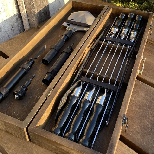 Этот набор включает в себя шампура с лезвиями, изготовленными из высококачественной сертифицированной нержавеющей стали, что гарантирует долговечность, прочность и устойчивость к коррозии на протяжении многих лет.