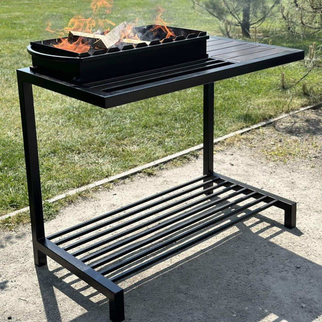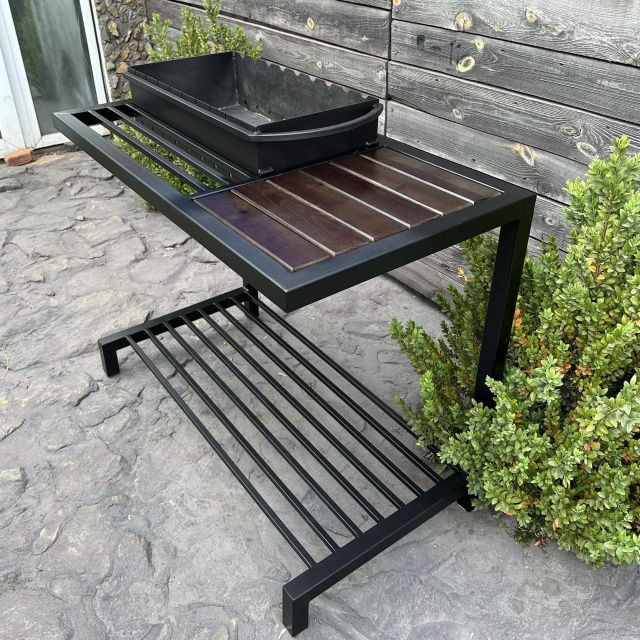 ДРОВНИЦА-СТОЛЕШНИЦА это не просто основа конструкции мангала-лофт. Это основа стиля и комфорта: жаровня удобно располагается внутри, погружаясь на 7 см; на деревянной полке вы можете разместить маринады, приправы, горячие блюда, а может и кружку с вашим любимым напитком, пока вы готовите. Ребра жесткости верхнего этажа не только добавляют конструкции надежности –; но могут пригодиться как дополнительное место для размещения принадлежностей, а нижний ярус предназначен для дров и угля. Мы позаботились даже о маленьких пустяках. - такие как приваренные крючки для ложки или щипцов, или кочерги – чтобы вы действительно получали удовольствие от процесса приготовления
