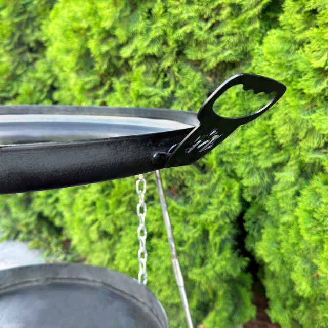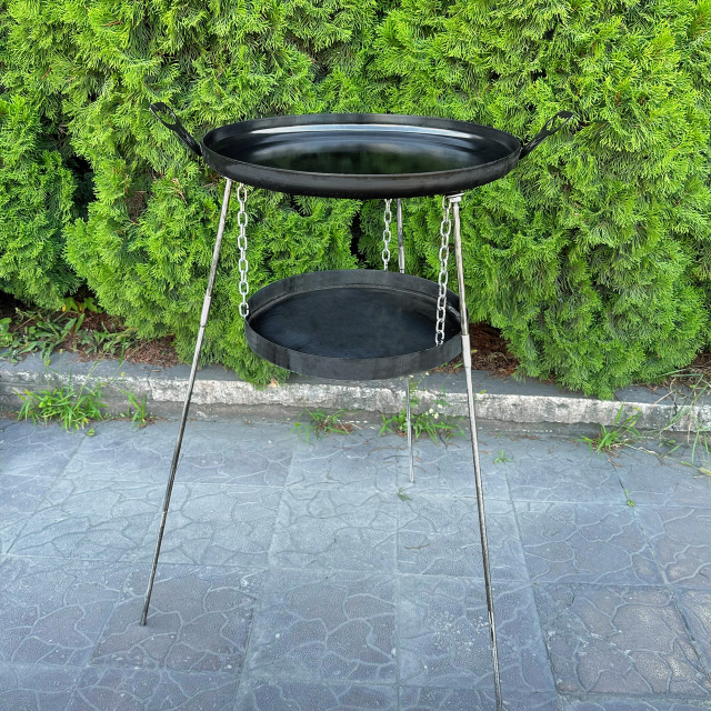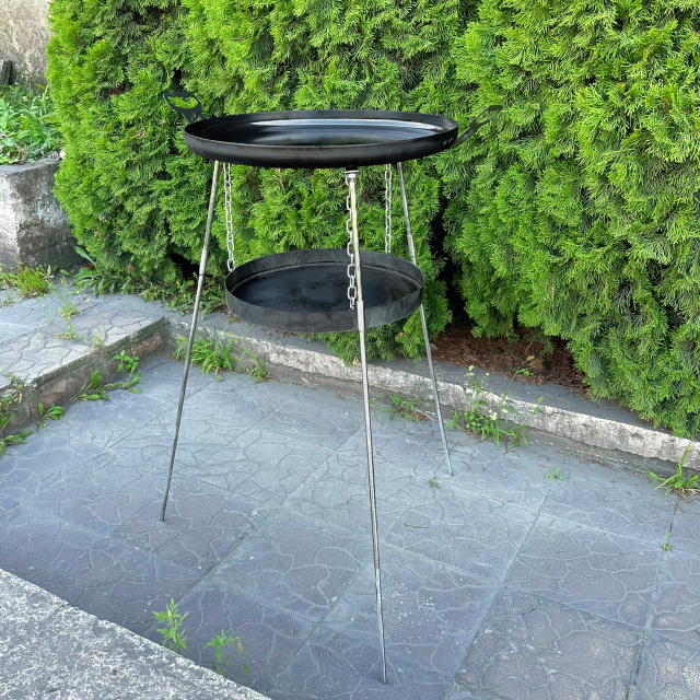 Еще одно преимущество - новые дизайнерские съемные ручки, съемные удлиненные ножки и подвес для огня. Это удобно для транспортировки и хранения, а также позволяет использовать сковороду в различных ситуациях, например, вы можете готовить вкусную пищу на открытом огне, а затем легко убрать ножки для удобства использования на мангале или печи. Подвес для огня исключает разведение костра на земле. Каждая ножка представляет собой два стальных прута длиной 250мм и 700мм Ø10мм.