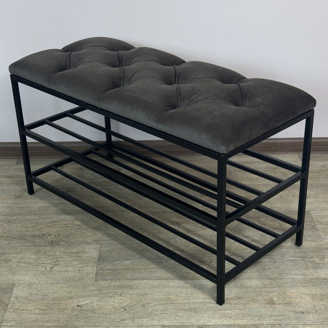Банкетка является многофункциональной мебелью, которая сочетает в себе стильный дизайн, прочность и надежность конструкции, а также функциональность. Сварной металлический каркас с 2 полками, изготовленный из профильных стальных труб сечением 15х15мм и 10х10мм и покрытый порошковой краской, является основой банкетки и обеспечивает ей высокую устойчивость и долговечность. Для изготовления сиденья используются поролон толщиной 50мм и износоустойчивый мебельный велюр, с применением разных способов обивки: каретная стяжка, линейная стяжка (утяжка) или просто ровные. Благодаря своему внешнему виду и полочкам Банкетку можно использовать в прихожей, гостиной, спальне, а также - в офисе, примерочной или пригородном доме (даче). На полки можно поставить не только обувь, но и журналы и книги, небольшую домашнюю технику или другие малогабаритные предметы. В целом, такая банкетка обещает быть практичным и стильным дополнением к вашему дому, предоставляя место для сидения и удобное хранение, а также придающее интерьеру современный дизайнерский штрих. Материал каркаса: профильные трубы 15х15мм, 10х10мм Покрытие каркаса: порошковая краска Обивочный материал: износоустойчивый мебельный велюр Характеристики Длина: 50, 60, 70, 80, 90 и 100 см Глубина: 35 см Высота: 45 см