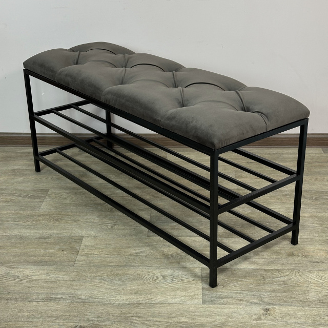 Банкетка является многофункциональной мебелью, которая сочетает в себе стильный дизайн, прочность и надежность конструкции, а также функциональность. Сварной металлический каркас с 2 полками, изготовленный из профильных стальных труб сечением 15х15мм и 10х10мм и покрытый порошковой краской, является основой банкетки и обеспечивает ей высокую устойчивость и долговечность. Для изготовления сиденья используются поролон толщиной 50мм и износоустойчивый мебельный велюр, с применением разных способов обивки: каретная стяжка, линейная стяжка (утяжка) или просто ровные. Благодаря своему внешнему виду и полочкам Банкетку можно использовать в прихожей, гостиной, спальне, а также - в офисе, примерочной или пригородном доме (даче). На полки можно поставить не только обувь, но и журналы и книги, небольшую домашнюю технику или другие малогабаритные предметы. В целом, такая банкетка обещает быть практичным и стильным дополнением к вашему дому, предоставляя место для сидения и удобное хранение, а также придающее интерьеру современный дизайнерский штрих. Материал каркаса: профильные трубы 15х15мм, 10х10мм Покрытие каркаса: порошковая краска Обивочный материал: износоустойчивый мебельный велюр Характеристики Длина: 50, 60, 70, 80, 90 и 100 см Глубина: 35 см Высота: 45 см
