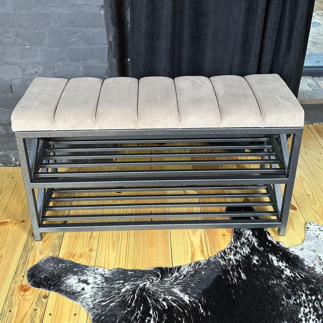 Банкетка в стиле Loft является многофункциональной мебелью, которая сочетает в себе стильный дизайн, прочность и надежность конструкции, а также функциональность. Сварной металлический каркас с 2 полками, изготовленный из профильных стальных труб сечением 25х25мм и 15х15мм и покрытый порошковой краской, является основой банкетки и обеспечивает ей высокую устойчивость и долговечность. Для изготовления сиденья используются поролон толщиной 50мм и износоустойчивый мебельный велюр, с применением разных способов обивки: каретная стяжка, линейная стяжка (утяжка) или просто ровные. Благодаря своему внешнему виду и полочкам Банкетку можно использовать в прихожей, гостиной, спальне, а также - в офисе, примерочной или пригородном доме (даче). На полки можно поставить не только обувь, но и журналы и книги, небольшую домашнюю технику или другие малогабаритные предметы. В целом, такая банкетка обещает быть практичным и стильным дополнением к вашему дому, предоставляя место для сидения и удобное хранение, а также придающее интерьеру современный дизайнерский штрих. Материал каркаса: профильные трубы 25х25мм, 15х15мм Покрытие каркаса: порошковая краска Обивочный материал: износоустойчивый мебельный велюр Характеристики Длина: 50, 60, 70, 80, 90 и 100 см Глубина: 35 см Высота: 56 см
