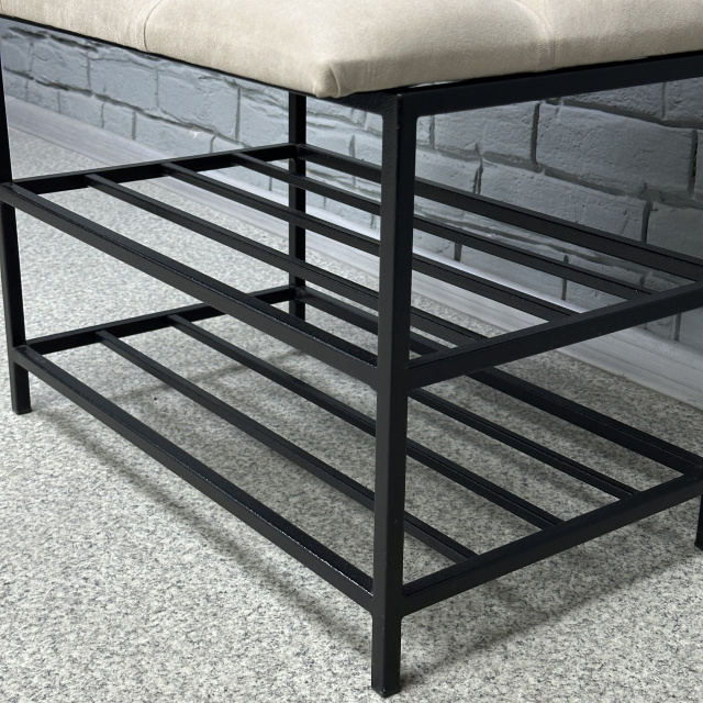 Банкетка является многофункциональной мебелью, которая сочетает в себе стильный дизайн, прочность и надежность конструкции, а также функциональность. Сварной металлический каркас с 2 полками, изготовленный из профильных стальных труб сечением 15х15мм и 10х10мм и покрытый порошковой краской, является основой банкетки и обеспечивает ей высокую устойчивость и долговечность. Для изготовления сиденья и спинки используются поролон толщиной 50мм и износоустойчивый мебельный велюр, с применением разных способов обивки: каретная стяжка, линейная стяжка (утяжка) или просто ровные. Благодаря своему внешнему виду и полочкам Банкетку можно использовать в прихожей, гостиной, спальне, а также - в офисе, примерочной или пригородном доме (даче). На полки можно поставить не только обувь, но и журналы и книги, небольшую домашнюю технику или другие малогабаритные предметы. В целом, такая банкетка обещает быть практичным и стильным дополнением к вашему дому, предоставляя место для сидения и удобное хранение, а также придающее интерьеру современный дизайнерский штрих. Материал каркаса: профильные трубы 15х15мм, 10х10мм Покрытие каркаса: порошковая краска Обивочный материал: износоустойчивый мебельный велюр Характеристики Длина: 50, 60, 70, 80, 90 и 100 см Глубина: 35 см Высота со спинкой: 78 см Высота сиденья: 45 см