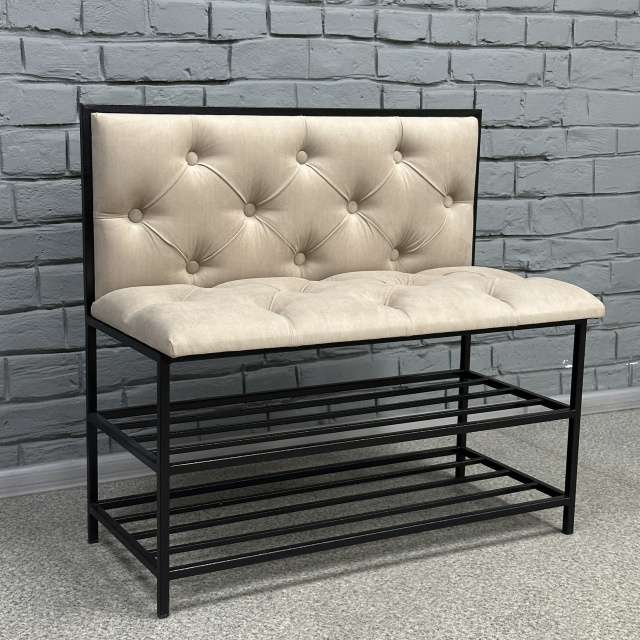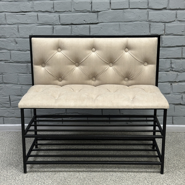 Банкетка является многофункциональной мебелью, которая сочетает в себе стильный дизайн, прочность и надежность конструкции, а также функциональность. Сварной металлический каркас с 2 полками, изготовленный из профильных стальных труб сечением 15х15мм и 10х10мм и покрытый порошковой краской, является основой банкетки и обеспечивает ей высокую устойчивость и долговечность. Для изготовления сиденья и спинки используются поролон толщиной 50мм и износоустойчивый мебельный велюр, с применением разных способов обивки: каретная стяжка, линейная стяжка (утяжка) или просто ровные. Благодаря своему внешнему виду и полочкам Банкетку можно использовать в прихожей, гостиной, спальне, а также - в офисе, примерочной или пригородном доме (даче). На полки можно поставить не только обувь, но и журналы и книги, небольшую домашнюю технику или другие малогабаритные предметы. В целом, такая банкетка обещает быть практичным и стильным дополнением к вашему дому, предоставляя место для сидения и удобное хранение, а также придающее интерьеру современный дизайнерский штрих. Материал каркаса: профильные трубы 15х15мм, 10х10мм Покрытие каркаса: порошковая краска Обивочный материал: износоустойчивый мебельный велюр Характеристики Длина: 50, 60, 70, 80, 90 и 100 см Глубина: 35 см Высота со спинкой: 78 см Высота сиденья: 45 см