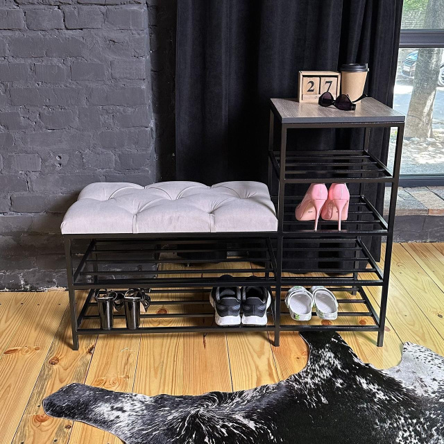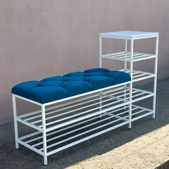 Банкетка является многофункциональной мебелью, которая сочетает в себе стильный дизайн, прочность и надежность конструкции, а также функциональность. Сварной металлический каркас с 2 полками и дополнительные полки для обуви (слева или справа), изготовлены из профильных стальных труб сечением 15х15мм и 10х10мм и покрыты порошковой краской, являются основой банкетки и обеспечивают ей высокую устойчивость и долговечность. Верхняя полчка изготовлена из ДСП толщиной 16мм. Для изготовления сиденья используются поролон толщиной 50мм и износоустойчивый мебельный велюр, с применением разных способов обивки: каретная стяжка, линейная стяжка (утяжка) или просто ровные. Благодаря своему внешнему виду и полочкам Банкетку можно использовать в прихожей, гостиной, спальне, а также - в офисе, примерочной или пригородном доме (даче). На полки можно поставить не только обувь, но и журналы и книги, небольшую домашнюю технику или другие малогабаритные предметы. В целом, такая банкетка обещает быть практичным и стильным дополнением к вашему дому, предоставляя место для сидения и удобное хранение, а также придающее интерьеру современный дизайнерский штрих. Материал каркаса и полок: профильные трубы 15х15мм, 10х10мм Покрытие каркаса и полок: порошковая краска Материал верхней полки: ДСП 16мм Обивочный материал: износоустойчивый мебельный велюр Характеристики Общая длина: 100 см Длина сиденья: 65 см Глубина: 35 см Высота с полками: 75 см Высота сиденья: 45 см