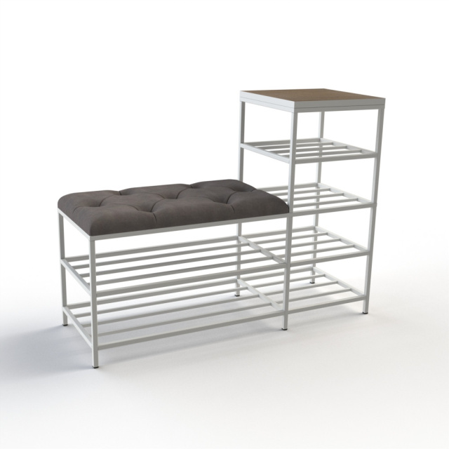 Банкетка является многофункциональной мебелью, которая сочетает в себе стильный дизайн, прочность и надежность конструкции, а также функциональность. Сварной металлический каркас с 2 полками и дополнительные полки для обуви (слева или справа), изготовлены из профильных стальных труб сечением 15х15мм и 10х10мм и покрыты порошковой краской, являются основой банкетки и обеспечивают ей высокую устойчивость и долговечность. Верхняя полчка изготовлена из ДСП толщиной 16мм. Для изготовления сиденья используются поролон толщиной 50мм и износоустойчивый мебельный велюр, с применением разных способов обивки: каретная стяжка, линейная стяжка (утяжка) или просто ровные. Благодаря своему внешнему виду и полочкам Банкетку можно использовать в прихожей, гостиной, спальне, а также - в офисе, примерочной или пригородном доме (даче). На полки можно поставить не только обувь, но и журналы и книги, небольшую домашнюю технику или другие малогабаритные предметы. В целом, такая банкетка обещает быть практичным и стильным дополнением к вашему дому, предоставляя место для сидения и удобное хранение, а также придающее интерьеру современный дизайнерский штрих. Материал каркаса и полок: профильные трубы 15х15мм, 10х10мм Покрытие каркаса и полок: порошковая краска Материал верхней полки: ДСП 16мм Обивочный материал: износоустойчивый мебельный велюр Характеристики Общая длина: 100 см Длина сиденья: 65 см Глубина: 35 см Высота с полками: 75 см Высота сиденья: 45 см