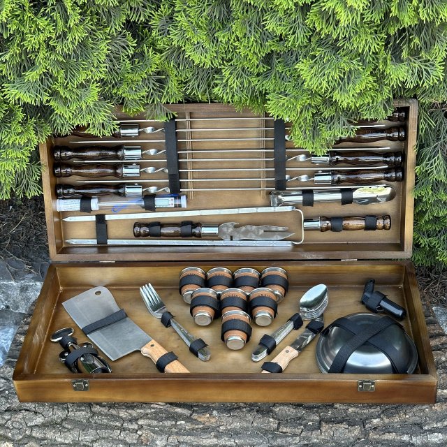 И что может быть лучше, чем набор, который также является произведением искусства? Кейс ручной работы изготовлен из натурального дерева жестких пород, и поэтому является не только элегантным аксессуаром для хранения и транспортировки, но и добавляет нотку изыска и роскоши в вашей кухне или на пикнике.