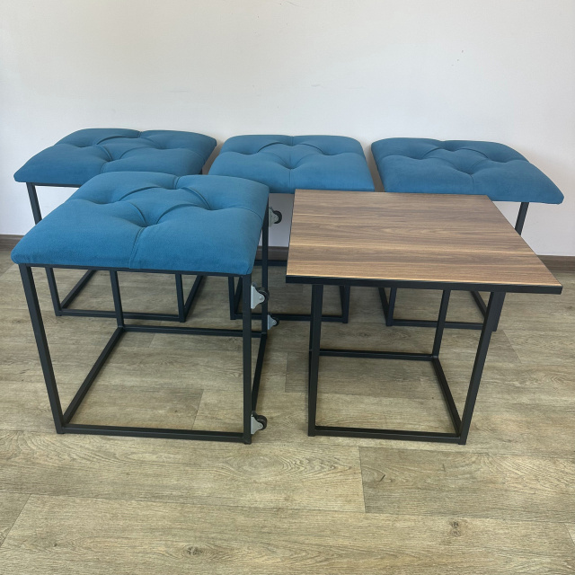 Пуф-трансформер является многофункциональной мебелью, которая сочетает в себе стильный дизайн, прочность и надежность конструкции, а также функциональность. В высоту Пуф 45см, в глубину и ширину - 47см и эти характеристики неизменны, но он раскладывается на 4 металлических стульчика с мягкими сиденьями и 1 столик высотой 45 см. Для удобного перемещения по полу Пуф оборудован 4 колесиками, а чтобы не повредить поверхность пола после трансформации, на ножках стульчиков установлены заглушки. Сварной металлический каркас (ножки стульчиков и столика) изготовлен из профильной стальной трубы сечением 15х15мм с толщиной стенки 1,5мм и покрыт порошковой краской черного цвета. Для изготовления сидений используются поролон толщиной 50мм и износоустойчивый мебельный велюр (7 цветов на выбор), с применением разных способов обивки: каретная стяжка или пиковка. Поверхность столика изготовлена из ДСП (5 цветов на выбор) толщиной 16мм. Благодаря своему внешнему виду и функциональности Пуф можно использовать в прихожей, гостиной, спальне, кухне, а также - в офисе, примерочной или пригородном доме (даче). В целом, такой Пуф обещает быть практичным и стильным дополнением к вашему дому, предоставляя удобное место для сидения, а также придающее интерьеру современный дизайнерский штрих. Вы можете указать в комментарии к заказу желаемый цвет обивочного материала и поверхности столика. В любом случае менеджер свяжется с Вами по указанным контактам для уточнения параметров Пуфа. Раскладывается на 4 стульчика и 1 столик высотой 45 см Материал каркаса (ножек): профильная труба 15х15х1,5мм Покрытие каркаса: порошковая краска Обивочный материал: износоустойчивый мебельный велюр Материал поверхности столика: ДСП 16мм Размеры (ДШВ): 47х47х45 см Максимальная нагрузка: 170 кг Цвет металлического каркаса: Черный (RAL 9005) Цвет обивки: Коричневый (1), Бирюзовый (2), Бежевый (3), Красный (4), Серо-коричневый (5), Светло-серый (6), Серый (7), Изумрудный (8), Синий (9), Черный (10) Цвет дерева: Риголетто темный (1), Дуб платиновый (2), Белая Аляска (3), Орех калифорнийский (4), Черный (5)
