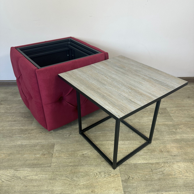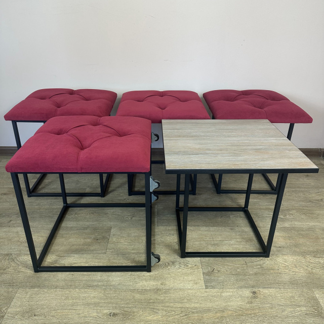 Пуф-трансформер является многофункциональной мебелью, которая сочетает в себе стильный дизайн, прочность и надежность конструкции, а также функциональность. В высоту Пуф 45см, в глубину и ширину - 47см и эти характеристики неизменны, но он раскладывается на 4 металлических стульчика с мягкими сиденьями и 1 столик высотой 45 см. Для удобного перемещения по полу Пуф оборудован 4 колесиками, а чтобы не повредить поверхность пола после трансформации, на ножках стульчиков установлены заглушки. Сварной металлический каркас (ножки стульчиков и столика) изготовлен из профильной стальной трубы сечением 15х15мм с толщиной стенки 1,5мм и покрыт порошковой краской черного цвета. Для изготовления сидений используются поролон толщиной 50мм и износоустойчивый мебельный велюр (7 цветов на выбор), с применением разных способов обивки: каретная стяжка или пиковка. Поверхность столика изготовлена из ДСП (5 цветов на выбор) толщиной 16мм. Благодаря своему внешнему виду и функциональности Пуф можно использовать в прихожей, гостиной, спальне, кухне, а также - в офисе, примерочной или пригородном доме (даче). В целом, такой Пуф обещает быть практичным и стильным дополнением к вашему дому, предоставляя удобное место для сидения, а также придающее интерьеру современный дизайнерский штрих. Вы можете указать в комментарии к заказу желаемый цвет обивочного материала и поверхности столика. В любом случае менеджер свяжется с Вами по указанным контактам для уточнения параметров Пуфа. Раскладывается на 4 стульчика и 1 столик высотой 45 см Материал каркаса (ножек): профильная труба 15х15х1,5мм Покрытие каркаса: порошковая краска Обивочный материал: износоустойчивый мебельный велюр Материал поверхности столика: ДСП 16мм Размеры (ДШВ): 47х47х45 см Максимальная нагрузка: 170 кг Цвет металлического каркаса: Черный (RAL 9005) Цвет обивки: Коричневый (1), Бирюзовый (2), Бежевый (3), Красный (4), Серо-коричневый (5), Светло-серый (6), Серый (7), Изумрудный (8), Синий (9), Черный (10) Цвет дерева: Риголетто темный (1), Дуб платиновый (2), Белая Аляска (3), Орех калифорнийский (4), Черный (5)