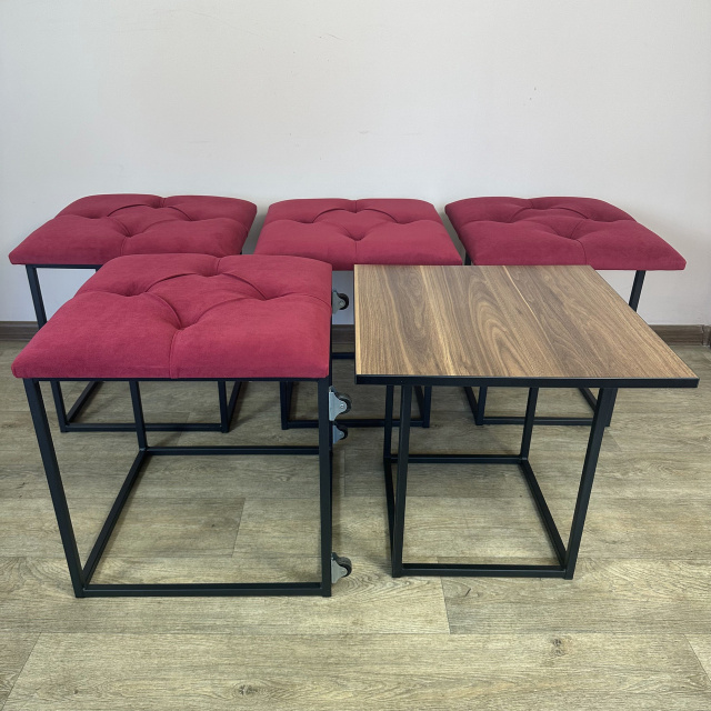 Пуф-трансформер является многофункциональной мебелью, которая сочетает в себе стильный дизайн, прочность и надежность конструкции, а также функциональность. В высоту Пуф 45см, в глубину и ширину - 47см и эти характеристики неизменны, но он раскладывается на 4 металлических стульчика с мягкими сиденьями и 1 столик высотой 45 см. Для удобного перемещения по полу Пуф оборудован 4 колесиками, а чтобы не повредить поверхность пола после трансформации, на ножках стульчиков установлены заглушки. Сварной металлический каркас (ножки стульчиков и столика) изготовлен из профильной стальной трубы сечением 15х15мм с толщиной стенки 1,5мм и покрыт порошковой краской черного цвета. Для изготовления сидений используются поролон толщиной 50мм и износоустойчивый мебельный велюр (7 цветов на выбор), с применением разных способов обивки: каретная стяжка или пиковка. Поверхность столика изготовлена из ДСП (5 цветов на выбор) толщиной 16мм. Благодаря своему внешнему виду и функциональности Пуф можно использовать в прихожей, гостиной, спальне, кухне, а также - в офисе, примерочной или пригородном доме (даче). В целом, такой Пуф обещает быть практичным и стильным дополнением к вашему дому, предоставляя удобное место для сидения, а также придающее интерьеру современный дизайнерский штрих. Вы можете указать в комментарии к заказу желаемый цвет обивочного материала и поверхности столика. В любом случае менеджер свяжется с Вами по указанным контактам для уточнения параметров Пуфа. Раскладывается на 4 стульчика и 1 столик высотой 45 см Материал каркаса (ножек): профильная труба 15х15х1,5мм Покрытие каркаса: порошковая краска Обивочный материал: износоустойчивый мебельный велюр Материал поверхности столика: ДСП 16мм Размеры (ДШВ): 47х47х45 см Максимальная нагрузка: 170 кг Цвет металлического каркаса: Черный (RAL 9005) Цвет обивки: Коричневый (1), Бирюзовый (2), Бежевый (3), Красный (4), Серо-коричневый (5), Светло-серый (6), Серый (7), Изумрудный (8), Синий (9), Черный (10) Цвет дерева: Риголетто темный (1), Дуб платиновый (2), Белая Аляска (3), Орех калифорнийский (4), Черный (5)