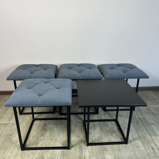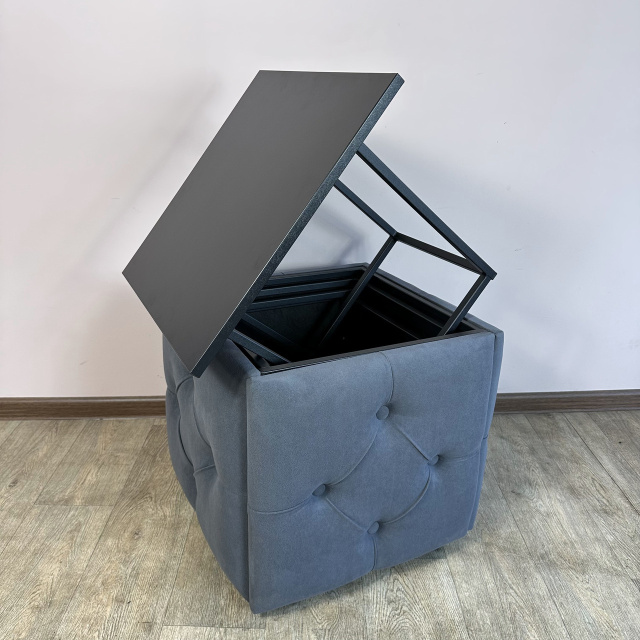 Пуф-трансформер является многофункциональной мебелью, которая сочетает в себе стильный дизайн, прочность и надежность конструкции, а также функциональность. В высоту Пуф 45см, в глубину и ширину - 47см и эти характеристики неизменны, но он раскладывается на 4 металлических стульчика с мягкими сиденьями и 1 столик высотой 45 см. Для удобного перемещения по полу Пуф оборудован 4 колесиками, а чтобы не повредить поверхность пола после трансформации, на ножках стульчиков установлены заглушки. Сварной металлический каркас (ножки стульчиков и столика) изготовлен из профильной стальной трубы сечением 15х15мм с толщиной стенки 1,5мм и покрыт порошковой краской черного цвета. Для изготовления сидений используются поролон толщиной 50мм и износоустойчивый мебельный велюр (7 цветов на выбор), с применением разных способов обивки: каретная стяжка или пиковка. Поверхность столика изготовлена из ДСП (5 цветов на выбор) толщиной 16мм. Благодаря своему внешнему виду и функциональности Пуф можно использовать в прихожей, гостиной, спальне, кухне, а также - в офисе, примерочной или пригородном доме (даче). В целом, такой Пуф обещает быть практичным и стильным дополнением к вашему дому, предоставляя удобное место для сидения, а также придающее интерьеру современный дизайнерский штрих. Вы можете указать в комментарии к заказу желаемый цвет обивочного материала и поверхности столика. В любом случае менеджер свяжется с Вами по указанным контактам для уточнения параметров Пуфа. Раскладывается на 4 стульчика и 1 столик высотой 45 см Материал каркаса (ножек): профильная труба 15х15х1,5мм Покрытие каркаса: порошковая краска Обивочный материал: износоустойчивый мебельный велюр Материал поверхности столика: ДСП 16мм Размеры (ДШВ): 47х47х45 см Максимальная нагрузка: 170 кг Цвет металлического каркаса: Черный (RAL 9005) Цвет обивки: Коричневый (1), Бирюзовый (2), Бежевый (3), Красный (4), Серо-коричневый (5), Светло-серый (6), Серый (7), Изумрудный (8), Синий (9), Черный (10) Цвет дерева: Риголетто темный (1), Дуб платиновый (2), Белая Аляска (3), Орех калифорнийский (4), Черный (5)