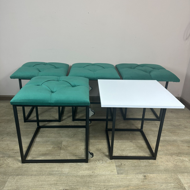 Пуф-трансформер является многофункциональной мебелью, которая сочетает в себе стильный дизайн, прочность и надежность конструкции, а также функциональность. В высоту Пуф 45см, в глубину и ширину - 47см и эти характеристики неизменны, но он раскладывается на 4 металлических стульчика с мягкими сиденьями и 1 столик высотой 45 см. Для удобного перемещения по полу Пуф оборудован 4 колесиками, а чтобы не повредить поверхность пола после трансформации, на ножках стульчиков установлены заглушки. Сварной металлический каркас (ножки стульчиков и столика) изготовлен из профильной стальной трубы сечением 15х15мм с толщиной стенки 1,5мм и покрыт порошковой краской черного цвета. Для изготовления сидений используются поролон толщиной 50мм и износоустойчивый мебельный велюр (7 цветов на выбор), с применением разных способов обивки: каретная стяжка или пиковка. Поверхность столика изготовлена из ДСП (5 цветов на выбор) толщиной 16мм. Благодаря своему внешнему виду и функциональности Пуф можно использовать в прихожей, гостиной, спальне, кухне, а также - в офисе, примерочной или пригородном доме (даче). В целом, такой Пуф обещает быть практичным и стильным дополнением к вашему дому, предоставляя удобное место для сидения, а также придающее интерьеру современный дизайнерский штрих. Вы можете указать в комментарии к заказу желаемый цвет обивочного материала и поверхности столика. В любом случае менеджер свяжется с Вами по указанным контактам для уточнения параметров Пуфа. Раскладывается на 4 стульчика и 1 столик высотой 45 см Материал каркаса (ножек): профильная труба 15х15х1,5мм Покрытие каркаса: порошковая краска Обивочный материал: износоустойчивый мебельный велюр Материал поверхности столика: ДСП 16мм Размеры (ДШВ): 47х47х45 см Максимальная нагрузка: 170 кг Цвет металлического каркаса: Черный (RAL 9005) Цвет обивки: Коричневый (1), Бирюзовый (2), Бежевый (3), Красный (4), Серо-коричневый (5), Светло-серый (6), Серый (7), Изумрудный (8), Синий (9), Черный (10) Цвет дерева: Риголетто темный (1), Дуб платиновый (2), Белая Аляска (3), Орех калифорнийский (4), Черный (5)