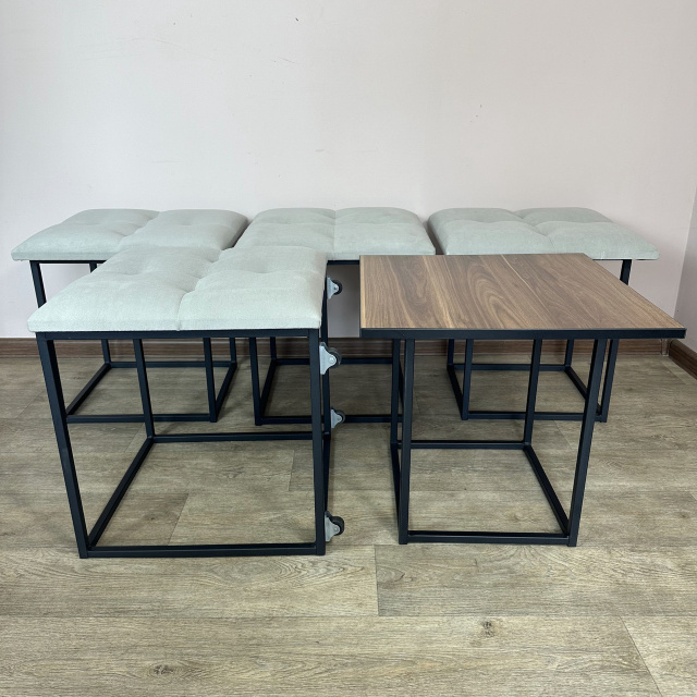 Пуф-трансформер является многофункциональной мебелью, которая сочетает в себе стильный дизайн, прочность и надежность конструкции, а также функциональность. В высоту Пуф 45см, в глубину и ширину - 47см и эти характеристики неизменны, но он раскладывается на 4 металлических стульчика с мягкими сиденьями и 1 столик высотой 45 см. Для удобного перемещения по полу Пуф оборудован 4 колесиками, а чтобы не повредить поверхность пола после трансформации, на ножках стульчиков установлены заглушки. Сварной металлический каркас (ножки стульчиков и столика) изготовлен из профильной стальной трубы сечением 15х15мм с толщиной стенки 1,5мм и покрыт порошковой краской черного цвета. Для изготовления сидений используются поролон толщиной 50мм и износоустойчивый мебельный велюр (7 цветов на выбор), с применением разных способов обивки: каретная стяжка или пиковка. Поверхность столика изготовлена из ДСП (5 цветов на выбор) толщиной 16мм. Благодаря своему внешнему виду и функциональности Пуф можно использовать в прихожей, гостиной, спальне, кухне, а также - в офисе, примерочной или пригородном доме (даче). В целом, такой Пуф обещает быть практичным и стильным дополнением к вашему дому, предоставляя удобное место для сидения, а также придающее интерьеру современный дизайнерский штрих. Вы можете указать в комментарии к заказу желаемый цвет обивочного материала и поверхности столика. В любом случае менеджер свяжется с Вами по указанным контактам для уточнения параметров Пуфа. Раскладывается на 4 стульчика и 1 столик высотой 45 см Материал каркаса (ножек): профильная труба 15х15х1,5мм Покрытие каркаса: порошковая краска Обивочный материал: износоустойчивый мебельный велюр Материал поверхности столика: ДСП 16мм Размеры (ДШВ): 47х47х45 см Максимальная нагрузка: 170 кг Цвет металлического каркаса: Черный (RAL 9005) Цвет обивки: Коричневый (1), Бирюзовый (2), Бежевый (3), Красный (4), Серо-коричневый (5), Светло-серый (6), Серый (7), Изумрудный (8), Синий (9), Черный (10) Цвет дерева: Риголетто темный (1), Дуб платиновый (2), Белая Аляска (3), Орех калифорнийский (4), Черный (5)