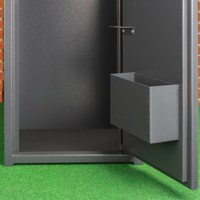 Внутри сейфа находится две зоны: одна предназначена для хранения оружия, а другая включает полку и отделение под патроны (трейзер), которое запирается замком Euro-lock с высоким уровнем секретности - 2000 комбинаций
