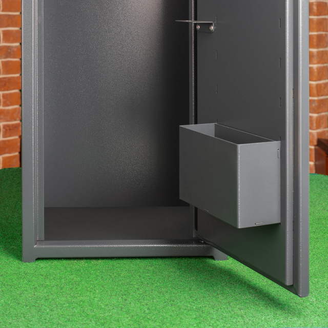 Внутри сейфа находится две зоны: одна предназначена для хранения оружия, а другая включает полку и отделение под патроны (трейзер), которое запирается замком Euro-lock с высоким уровнем секретности - 2000 комбинаций