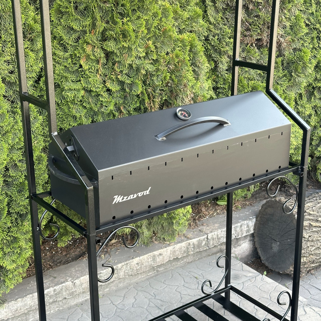 Жаровня-барбекю с крышкой и термометром изготовлена из 3-миллиметрового металла и покрыта термостойкой эмалью черного цвета, которая сохраняет свои свойства при температуре до 800°C.