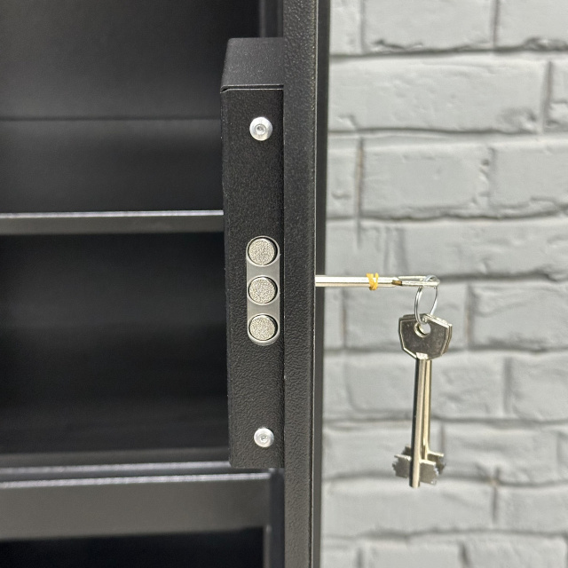Двухсекционный сейф, каждая секция имеет дверь и закрывается отдельным замком сувальдного типа с 3 ригелями диаметром 10 мм (горизонтальное отпирание). Верхняя секция оборудована 1 съемной полкой и кассовым отделением, замыкающееся замком Euro-lock с секретностью - 2000 комбинаций. Нижняя секция разделена 1 съемной полкой.
