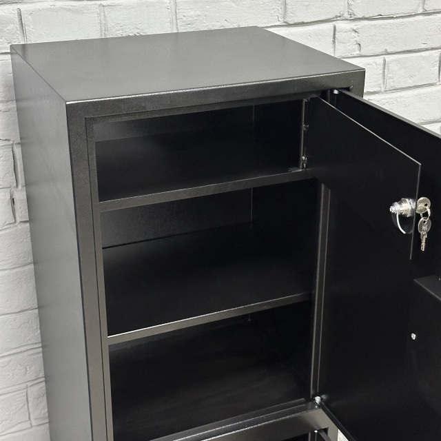 Сейф окрашен порошковой краской, что придает ему приятный вид и защищает от коррозии. Цвета на выбор: серый (RAL 7046), черный (RAL 9005)