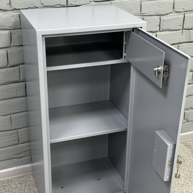 Сейфы офисные серии СБЕ предназначены для хранения документов. Сейфы оборудованы кассовым отделением для сохранения денег и печатей. Конструкция корпуса выполнена из листов стали толщиной 1мм (корпус) и 1,5мм (дверная плита). Надежный ключевой замок сувальдного типа с 3 ригелями диаметром 10 мм (горизонтальное отпирание) оградит ваши документы или ценности от посторонних. В сейфе есть кассовое отделение, которое запирается замком Euro-lock (секретность – 2000 комбинаций). Также в сейфе есть съемная полка. Сейф окрашен порошковой краской, что придает ему приятный вид и защищает от коррозии. Цвета на выбор: серый (RAL 7046), черный (RAL 9005) Габаритные размеры Высота 88 см Ширина 44 см Глубина 36 см Вес 25,6 кг