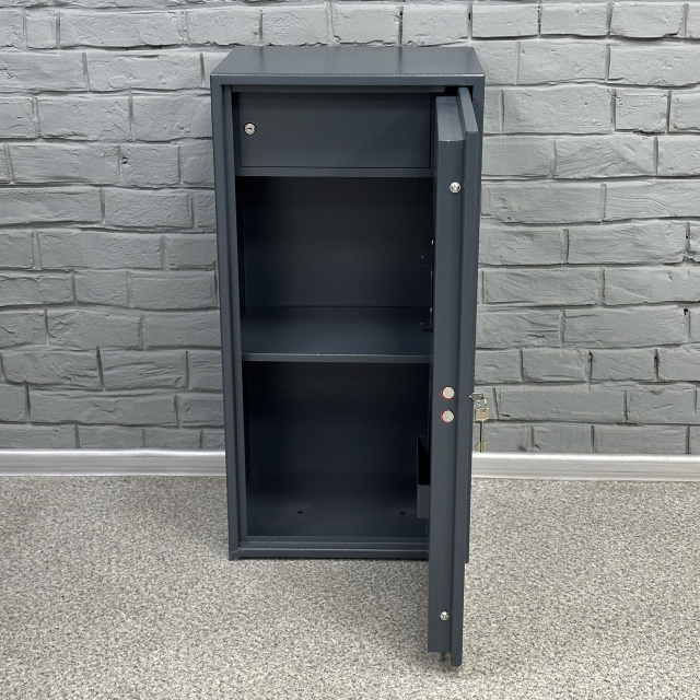 В сейфе есть кассовое отделение, которое запирается замком Euro-lock (секретность – 2000 комбинаций). Также в сейфе есть съемная полка.