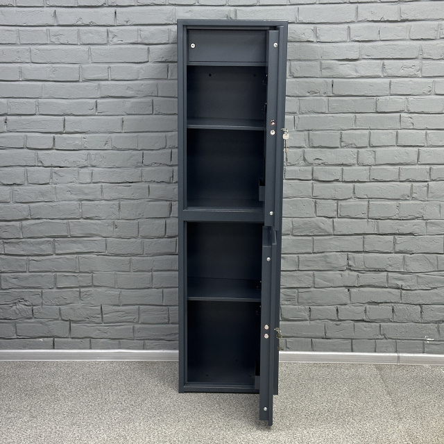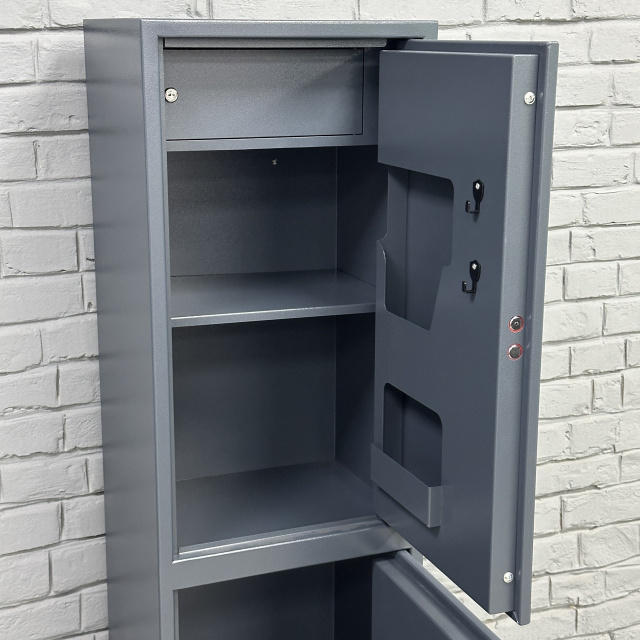 Двухсекционный сейф, каждая секция имеет дверь и закрывается отдельным замком сувальдного типа с 2 ригелями диаметром 16 мм (горизонтальное отпирание). Верхняя секция оборудована 1 съемной полкой и кассовым отделением, замыкающееся замком Euro-lock с секретностью - 2000 комбинаций. Нижняя секция разделена 1 съемной полкой.