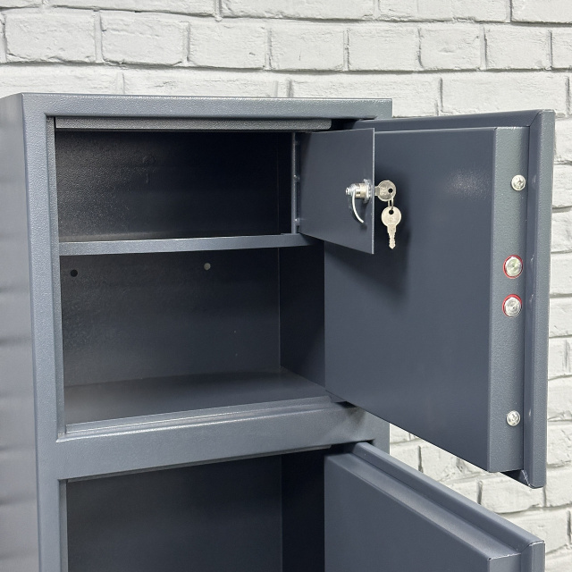 Четырехсекционный сейф, каждая секция имеет дверь и закрывается отдельным замком сувальдного типа с 2 ригелями диаметром 16 мм (горизонтальное отпирание). Верхняя секция оборудована кассовым отделением, замыкающееся замком Euro-lock с секретностью - 2000 комбинаций.