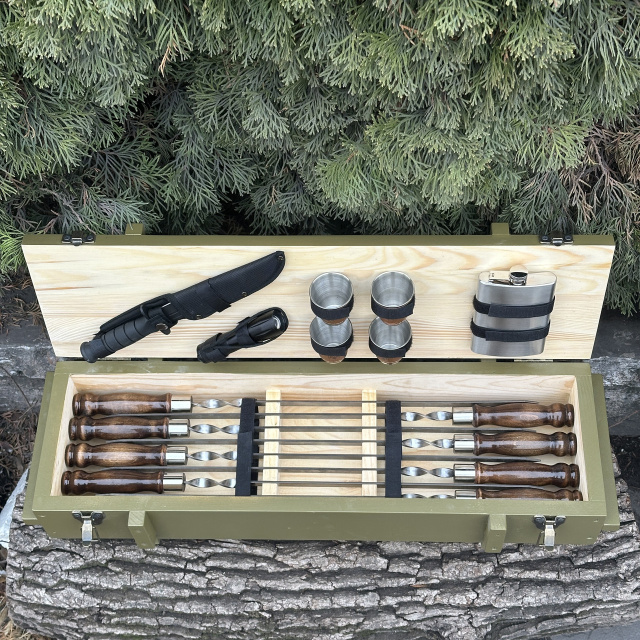 Впечатляющий Подарочный набор шампуров Милитари - идеальный подарок для любителей гриля и мастеров кулинарии! Этот набор включает в себя шампура с лезвиями, изготовленными из высококачественной сертифицированной нержавеющей стали, что гарантирует долговечность, прочность и устойчивость к коррозии на протяжении многих лет. Ручки шампуров выполнены из прочного дуба, который обладает не только элегантным видом, но и комфортным ощущением в руке. Благодаря своей природной прочности, деревянные ручки обеспечивают безопасность и удобство при готовке. И что может быть лучше, чем набор, который также является произведением искусства? Кейс ручной работы изготовлен из натурального дерева твердых пород, и поэтому является не только элегантным аксессуаром для хранения и транспортировки, но и добавляет нотку изыска и роскоши в вашей кухне или на пикнике. Подарочный набор шампуров - символ гостеприимства и радости приготовления пищи на открытом воздухе. Будьте уверены, что ваш подарок будет востребован и оценен на любом мероприятии. Не упустите возможность порадовать ваших близких или друзей этим роскошным подарком, который сочетает в себе высокое качество, элегантность и удобство. Закажите Подарочный набор шампуров прямо сейчас! В комплект входит: Кейс из дерева 740х250х160 мм 6 шампуров с деревянной ручкой 3*12*630 мм 4 рюмкм Фляга Охотничий нож в чехле Фонарик Мангал Завод - Качественно и Прозрачно Стальная гарантия Мы гарантируем, что наши мангалы прослужат Вам не менее 10 лет. Распакуй и жарь! Мы можем укомплектовать мангал всем необходим для того, чтобы Вы приступили к готовке сразу после получения товара. Быстрая доставка Получите мангал в кратчайшие сроки по всей Украине. Ничего лишнего Только вкус мяса. Мы используем только нетоксичную термостойкую краску, которая выдерживает температуру 800°С. Европейское качество Мы завод - вся продукция серийного производства на высокоточном лазерном оборудовании из сертифицированной стали. 3000 отзывов Присоединяйся к лагерю ценителей мяса!
