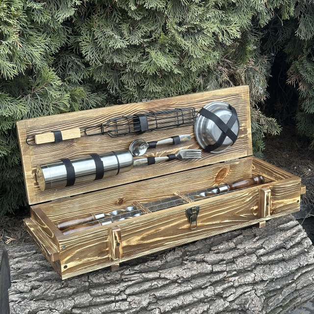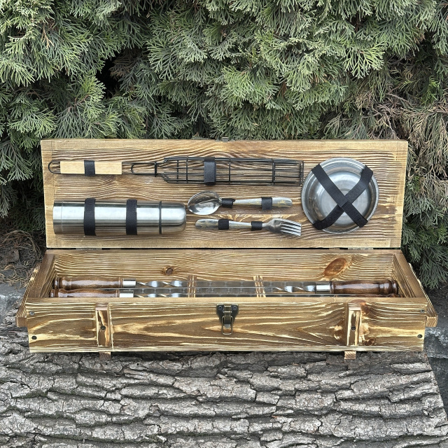 И что может быть лучше, чем набор, который также является произведением искусства? Кейс ручной работы изготовлен из натурального дерева твердых пород, и поэтому является не только элегантным аксессуаром для хранения и транспортировки, но и добавляет нотку изыска и роскоши в вашей кухне или на пикнике.