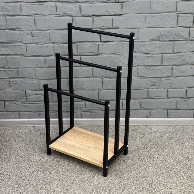 Стойка состоит из трех горизонтальных перекладин, расположенных на разных уровнях, что позволяет удобно развешивать полотенца, пледы или одежду. В нижней части изделия предусмотрена полка из плиты ЛДСП - идеальное место для хранения обуви, корзин или других мелочей.