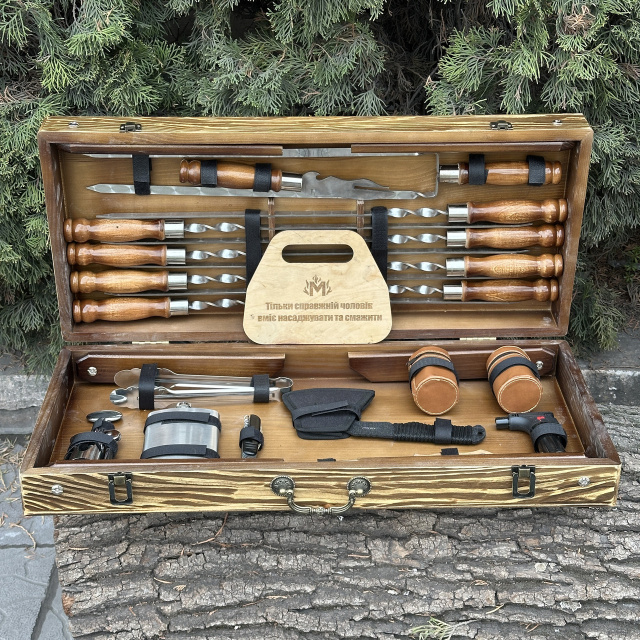 Впечатляющий Подарочный Набор шампуров кейс-стол "Атаман" - идеальный подарок для любителей гриля и мастеров кулинарии! Этот набор включает в себя шампура с лезвиями, изготовленными из высококачественной сертифицированной нержавеющей стали, что гарантирует долговечность, прочность и устойчивость к коррозии на протяжении многих лет. Ручки шампуров выполнены из прочного дуба, который обладает не только элегантным видом, но и комфортным ощущением в руке. Благодаря своей природной прочности, деревянные ручки обеспечивают безопасность и удобство при готовке. И что может быть лучше, чем набор, который также является произведением искусства? Кейс-стол ручной работы изготовлен из натурального дерева твердых пород, и поэтому является не только элегантным аксессуаром для хранения и транспортировки, но и добавляет нотку изыска и роскоши в вашей кухне или на пикнике. Главной особенностью такого кейса является наличие 6 складывающихся ножек, с помощью которых кейс с легкостью трансформируется в удобный и довольно вместительный стол для пикника. Подарочный набор шампуров - символ гостеприимства и радости приготовления пищи на открытом воздухе. Будьте уверены, что ваш подарок будет востребован и оценен на любом мероприятии. Не упустите возможность порадовать ваших близких или друзей этим роскошным подарком, который сочетает в себе высокое качество, элегантность и удобство. Закажите Подарочный набор шампуров прямо сейчас! В комплект входит: Кейс из дерева 680х300х110 мм 8 шампуров Люкс 630х12х3 мм Двойной шампур Люкс Вилка для снятия мяса Люкс Щипцы для мяса большие Топор Охотничий нож Многофункциональный складной нож Фляга 8 рюмок 75 мл Штопор Турбо-зажигалка Веер деревянный с гравировкой MZavod Мангал Завод - Качественно и Прозрачно Стальная гарантия Мы гарантируем, что наши мангалы прослужат Вам не менее 10 лет. Распакуй и жарь! Мы можем укомплектовать мангал всем необходим для того, чтобы Вы приступили к готовке сразу после получения товара. Быстрая доставка Получите мангал в кратчайшие сроки по всей Украине. Ничего лишнего Только вкус мяса. Мы используем только нетоксичную термостойкую краску, которая выдерживает температуру 800°С. Европейское качество Мы завод - вся продукция серийного производства на высокоточном лазерном оборудовании из сертифицированной стали. 3000 отзывов Присоединяйся к лагерю ценителей мяса!