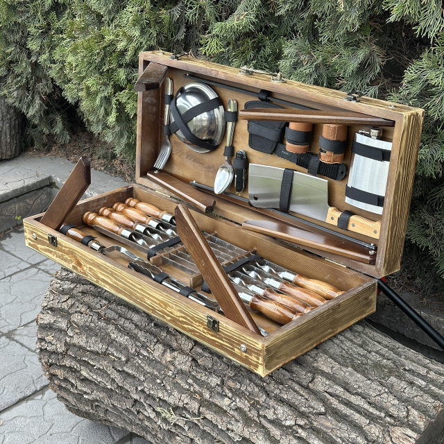 Впечатляющий Подарочный Набор шампуров кейс-стол "Пикник" - идеальный подарок для любителей гриля и мастеров кулинарии! Этот набор включает в себя шампура с лезвиями, изготовленными из высококачественной сертифицированной нержавеющей стали, что гарантирует долговечность, прочность и устойчивость к коррозии на протяжении многих лет. Ручки шампуров выполнены из прочного дуба, который обладает не только элегантным видом, но и комфортным ощущением в руке. Благодаря своей природной прочности, деревянные ручки обеспечивают безопасность и удобство при готовке. И что может быть лучше, чем набор, который также является произведением искусства? Кейс-стол ручной работы изготовлен из натурального дерева твердых пород, и поэтому является не только элегантным аксессуаром для хранения и транспортировки, но и добавляет нотку изыска и роскоши в вашей кухне или на пикнике. Главной особенностью такого кейса является наличие 6 складывающихся ножек, с помощью которых кейс с легкостью трансформируется в удобный и довольно вместительный стол для пикника. Подарочный набор шампуров - символ гостеприимства и радости приготовления пищи на открытом воздухе. Будьте уверены, что ваш подарок будет востребован и оценен на любом мероприятии. Не упустите возможность порадовать ваших близких или друзей этим роскошным подарком, который сочетает в себе высокое качество, элегантность и удобство. Закажите Подарочный набор шампуров прямо сейчас! В комплект входит: Кейс из дерева 680х300х110 мм 8 шампуров Люкс 630х12х3 мм Двойной шампур Люкс 2 подставки для шампуров (альтернатива мангалу) Щипцы для мяса маленькие Тесак Топор Многофункциональный складной нож Фляга 8 тарелок 8 ложек 8 вилок 8 рюмок 30 мл Веер деревянный с гравировкой MZavod Мангал Завод - Качественно и Прозрачно Стальная гарантия Мы гарантируем, что наши мангалы прослужат Вам не менее 10 лет. Распакуй и жарь! Мы можем укомплектовать мангал всем необходим для того, чтобы Вы приступили к готовке сразу после получения товара. Быстрая доставка Получите мангал в кратчайшие сроки по всей Украине. Ничего лишнего Только вкус мяса. Мы используем только нетоксичную термостойкую краску, которая выдерживает температуру 800°С. Европейское качество Мы завод - вся продукция серийного производства на высокоточном лазерном оборудовании из сертифицированной стали. 3000 отзывов Присоединяйся к лагерю ценителей мяса!