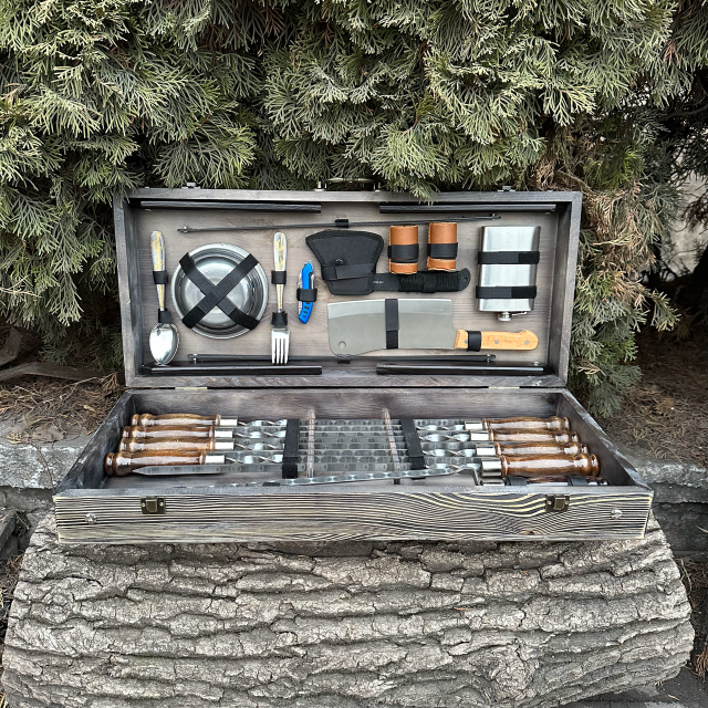 Впечатляющий Подарочный Набор шампуров кейс-стол "Пикник" - идеальный подарок для любителей гриля и мастеров кулинарии! Этот набор включает в себя шампура с лезвиями, изготовленными из высококачественной сертифицированной нержавеющей стали, что гарантирует долговечность, прочность и устойчивость к коррозии на протяжении многих лет. Ручки шампуров выполнены из прочного дуба, который обладает не только элегантным видом, но и комфортным ощущением в руке. Благодаря своей природной прочности, деревянные ручки обеспечивают безопасность и удобство при готовке. И что может быть лучше, чем набор, который также является произведением искусства? Кейс-стол ручной работы изготовлен из натурального дерева твердых пород, и поэтому является не только элегантным аксессуаром для хранения и транспортировки, но и добавляет нотку изыска и роскоши в вашей кухне или на пикнике. Главной особенностью такого кейса является наличие 6 складывающихся ножек, с помощью которых кейс с легкостью трансформируется в удобный и довольно вместительный стол для пикника. Подарочный набор шампуров - символ гостеприимства и радости приготовления пищи на открытом воздухе. Будьте уверены, что ваш подарок будет востребован и оценен на любом мероприятии. Не упустите возможность порадовать ваших близких или друзей этим роскошным подарком, который сочетает в себе высокое качество, элегантность и удобство. Закажите Подарочный набор шампуров прямо сейчас! В комплект входит: Кейс из дерева 680х300х110 мм 8 шампуров Люкс 630х12х3 мм Двойной шампур Люкс 2 подставки для шампуров (альтернатива мангалу) Щипцы для мяса маленькие Тесак Топор Многофункциональный складной нож Фляга 8 тарелок 8 ложек 8 вилок 8 рюмок 30 мл Веер деревянный с гравировкой MZavod Мангал Завод - Качественно и Прозрачно Стальная гарантия Мы гарантируем, что наши мангалы прослужат Вам не менее 10 лет. Распакуй и жарь! Мы можем укомплектовать мангал всем необходим для того, чтобы Вы приступили к готовке сразу после получения товара. Быстрая доставка Получите мангал в кратчайшие сроки по всей Украине. Ничего лишнего Только вкус мяса. Мы используем только нетоксичную термостойкую краску, которая выдерживает температуру 800°С. Европейское качество Мы завод - вся продукция серийного производства на высокоточном лазерном оборудовании из сертифицированной стали. 3000 отзывов Присоединяйся к лагерю ценителей мяса!