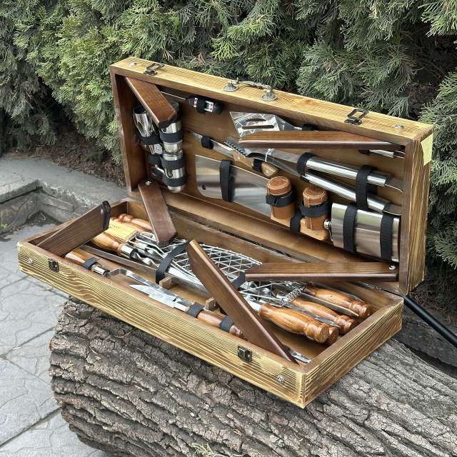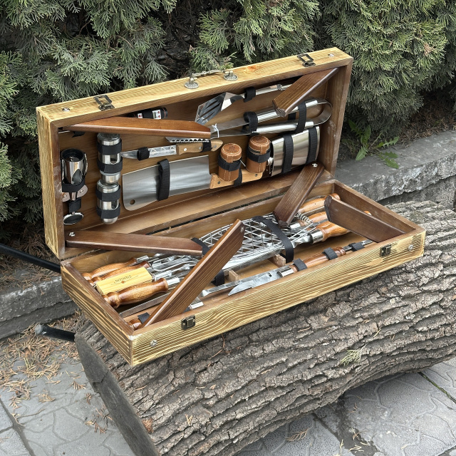 Впечатляющий Подарочный Набор шампуров кейс-стол "Мастер Гриль" - идеальный подарок для любителей гриля и мастеров кулинарии! Этот набор включает в себя шампура с лезвиями, изготовленными из высококачественной сертифицированной нержавеющей стали, что гарантирует долговечность, прочность и устойчивость к коррозии на протяжении многих лет. Ручки шампуров выполнены из прочного дуба, который обладает не только элегантным видом, но и комфортным ощущением в руке. Благодаря своей природной прочности, деревянные ручки обеспечивают безопасность и удобство при готовке. И что может быть лучше, чем набор, который также является произведением искусства? Кейс-стол ручной работы изготовлен из натурального дерева твердых пород, и поэтому является не только элегантным аксессуаром для хранения и транспортировки, но и добавляет нотку изыска и роскоши в вашей кухне или на пикнике. Главной особенностью такого кейса является наличие 6 складывающихся ножек, с помощью которых кейс с легкостью трансформируется в удобный и довольно вместительный стол для пикника. Подарочный набор шампуров - символ гостеприимства и радости приготовления пищи на открытом воздухе. Будьте уверены, что ваш подарок будет востребован и оценен на любом мероприятии. Не упустите возможность порадовать ваших близких или друзей этим роскошным подарком, который сочетает в себе высокое качество, элегантность и удобство. Закажите Подарочный набор шампуров прямо сейчас! В комплект входит: Кейс из дерева 680х300х110 мм 8 шампуров Люкс 630х12х3 мм Двойной шампур Люкс Вилка для снятия мяса Мини – решетка для рыбы Щипцы для мяса большие Лопатка Тесак Охотничий нож Фляга 8 рюмок 30 мл Штопор Термометр для мяса 2 Банки для специй Мангал Завод - Качественно и Прозрачно Стальная гарантия Мы гарантируем, что наши мангалы прослужат Вам не менее 10 лет. Распакуй и жарь! Мы можем укомплектовать мангал всем необходим для того, чтобы Вы приступили к готовке сразу после получения товара. Быстрая доставка Получите мангал в кратчайшие сроки по всей Украине. Ничего лишнего Только вкус мяса. Мы используем только нетоксичную термостойкую краску, которая выдерживает температуру 800°С. Европейское качество Мы завод - вся продукция серийного производства на высокоточном лазерном оборудовании из сертифицированной стали. 3000 отзывов Присоединяйся к лагерю ценителей мяса!