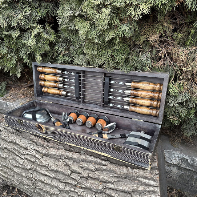 Впечатляющий Подарочный набор шампуров Есаул - идеальный подарок для любителей гриля и мастеров кулинарии! Этот набор включает в себя шампура с лезвиями, изготовленными из высококачественной сертифицированной нержавеющей стали, что гарантирует долговечность, прочность и устойчивость к коррозии на протяжении многих лет. Ручки шампуров выполнены из прочного дуба, который обладает не только элегантным видом, но и комфортным ощущением в руке. Благодаря своей природной прочности, деревянные ручки обеспечивают безопасность и удобство при готовке. И что может быть лучше, чем набор, который также является произведением искусства? Кейс ручной работы изготовлен из натурального дерева жестких пород, и поэтому является не только элегантным аксессуаром для хранения и транспортировки, но и добавляет нотку изыска и роскоши в вашей кухне или на пикнике. Подарочный набор шампуров - символ гостеприимства и радости приготовления пищи на открытом воздухе. Будьте уверены, что ваш подарок будет востребован и оценен на любом мероприятии. Не упустите возможность порадовать ваших близких или друзей этим роскошным подарком, который сочетает в себе высокое качество, элегантность и удобство. Закажите Подарочный набор шампуров прямо сейчас! В комплекте: Кейс из дерева размер 720*120*210 мм Охотничий нож 8 шампуров 3*12*630 мм Вилка для снятия мяса 6 тарелок 6 вилок 6 ложек Фляга 4 рюмки Мангал Завод - Качественно и Прозрачно Стальная гарантия Мы гарантируем, что наши мангалы прослужат Вам не менее 10 лет. Распакуй и жарь! Мы можем укомплектовать мангал всем необходим для того, чтобы Вы приступили к готовке сразу после получения товара. Быстрая доставка Получите мангал в кратчайшие сроки по всей Украине. Ничего лишнего Только вкус мяса. Мы используем только нетоксичную термостойкую краску, которая выдерживает температуру 800°С. Европейское качество Мы завод - вся продукция серийного производства на высокоточном лазерном оборудовании из сертифицированной стали. 3000 отзывов Присоединяйся к лагерю ценителей мяса!