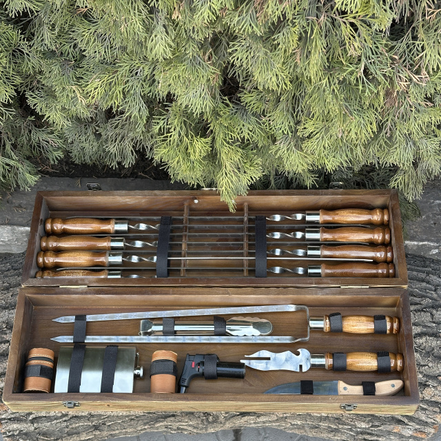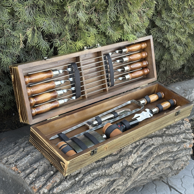 Впечатляющий Подарочный набор шампуров Охотник - идеальный подарок для любителей гриля и мастеров кулинарии! Этот набор включает в себя шампура с лезвиями, изготовленными из высококачественной сертифицированной нержавеющей стали, что гарантирует долговечность, прочность и устойчивость к коррозии на протяжении многих лет. Ручки шампуров выполнены из прочного дуба, который обладает не только элегантным видом, но и комфортным ощущением в руке. Благодаря своей природной прочности, деревянные ручки обеспечивают безопасность и удобство при готовке. И что может быть лучше, чем набор, который также является произведением искусства? Кейс ручной работы изготовлен из натурального дерева жестких пород, и поэтому является не только элегантным аксессуаром для хранения и транспортировки, но и добавляет нотку изыска и роскоши в вашей кухне или на пикнике. Подарочный набор шампуров - символ гостеприимства и радости приготовления пищи на открытом воздухе. Будьте уверены, что ваш подарок будет востребован и оценен на любом мероприятии. Не упустите возможность порадовать ваших близких или друзей этим роскошным подарком, который сочетает в себе высокое качество, элегантность и удобство. Закажите Подарочный набор шампуров прямо сейчас! В комплекте: Кейс из дерева размер 720*120*210 мм 8 шампуров 3*12*630 мм Двойной шампур Щипцы для барбекю Фляга 8 рюмок Охотничий нож Турбо зажигалка Вилка для снятия мяса Мангал Завод - Качественно и Прозрачно Стальная гарантия Мы гарантируем, что наши мангалы прослужат Вам не менее 10 лет. Распакуй и жарь! Мы можем укомплектовать мангал всем необходим для того, чтобы Вы приступили к готовке сразу после получения товара. Быстрая доставка Получите мангал в кратчайшие сроки по всей Украине. Ничего лишнего Только вкус мяса. Мы используем только нетоксичную термостойкую краску, которая выдерживает температуру 800°С. Европейское качество Мы завод - вся продукция серийного производства на высокоточном лазерном оборудовании из сертифицированной стали. 3000 отзывов Присоединяйся к лагерю ценителей мяса!