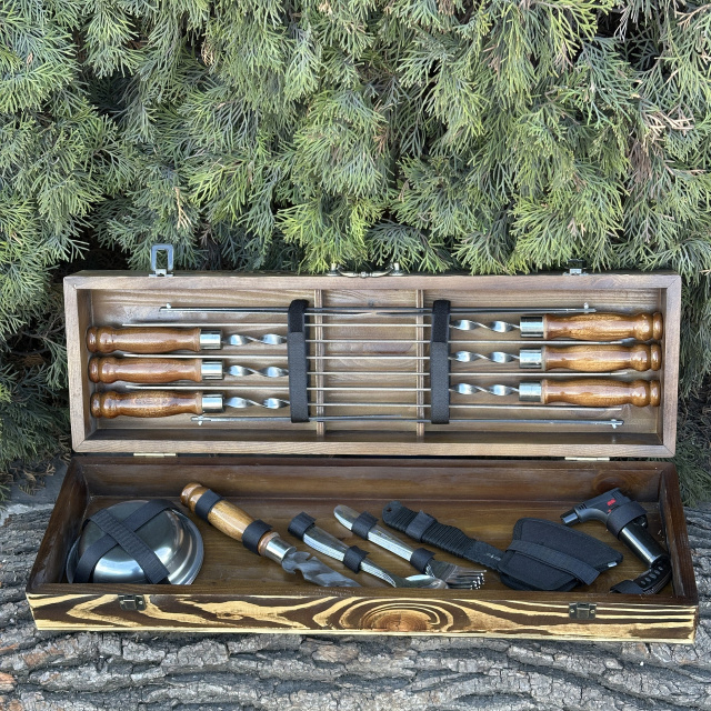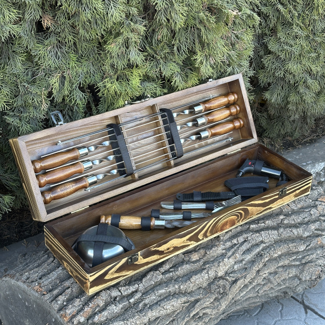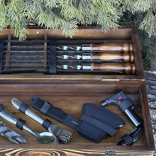 Впечатляющий Подарочный набор шампуров Гетьман - идеальный подарок для любителей гриля и мастеров кулинарии! Этот набор включает в себя шампура с лезвиями, изготовленными из высококачественной сертифицированной нержавеющей стали, что гарантирует долговечность, прочность и устойчивость к коррозии на протяжении многих лет. Ручки шампуров выполнены из прочного дуба, который обладает не только элегантным видом, но и комфортным ощущением в руке. Благодаря своей природной прочности, деревянные ручки обеспечивают безопасность и удобство при готовке. И что может быть лучше, чем набор, который также является произведением искусства? Кейс ручной работы изготовлен из натурального дерева жестких пород, и поэтому является не только элегантным аксессуаром для хранения и транспортировки, но и добавляет нотку изыска и роскоши в вашей кухне или на пикнике. Подарочный набор шампуров - символ гостеприимства и радости приготовления пищи на открытом воздухе. Будьте уверены, что ваш подарок будет востребован и оценен на любом мероприятии. Не упустите возможность порадовать ваших близких или друзей этим роскошным подарком, который сочетает в себе высокое качество, элегантность и удобство. Закажите Подарочный набор шампуров прямо сейчас! В комплекте: Кейс из дерева размер 720*120*210 мм 6 шампуров 3*12*630 мм 2 подставки для шампуров (альтернатива мангалу) Вилка для снятия мяса 6 тарелок 6 вилок 6 ложек Складной нож Турбо зажигалка Топор Мангал Завод - Качественно и Прозрачно Стальная гарантия Мы гарантируем, что наши мангалы прослужат Вам не менее 10 лет. Распакуй и жарь! Мы можем укомплектовать мангал всем необходим для того, чтобы Вы приступили к готовке сразу после получения товара. Быстрая доставка Получите мангал в кратчайшие сроки по всей Украине. Ничего лишнего Только вкус мяса. Мы используем только нетоксичную термостойкую краску, которая выдерживает температуру 800°С. Европейское качество Мы завод - вся продукция серийного производства на высокоточном лазерном оборудовании из сертифицированной стали. 3000 отзывов Присоединяйся к лагерю ценителей мяса!