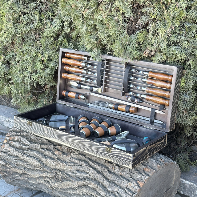 И что может быть лучше, чем набор, который также является произведением искусства? Кейс ручной работы изготовлен из натурального дерева жестких пород, и поэтому является не только элегантным аксессуаром для хранения и транспортировки, но и добавляет нотку изыска и роскоши в вашей кухне или на пикнике.