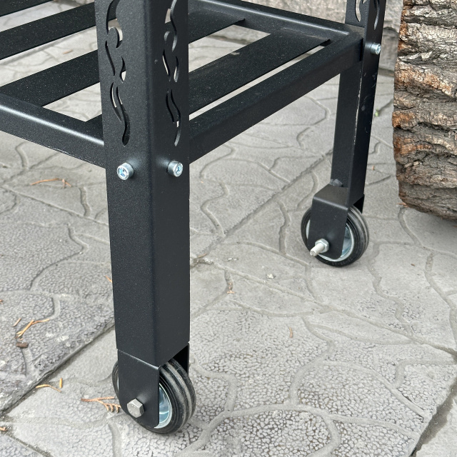 С вместительной разборной дровницей нашего мангала вы сможете иметь постоянный доступ к дровам, что позволит приготовить большее количество блюд с неповторимым ароматом, который несравним с готовкой на дровах. С одной стороны ножки оборудованы колесами для удобного и быстрого перемещения мангала. Также к дровнице крепятся две съемные боковые полки-ручки.