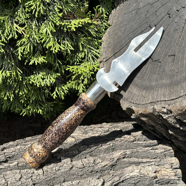 Вилка с деревянной ручкой для снятия мяса с шампура, изготовленная из нержавеющей стали, предназначена для удобного и безопасного обращения с мясом на шампурах при готовке на гриле или костре.