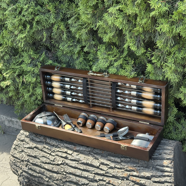 И что может быть лучше, чем набор, который также является произведением искусства? Кейс ручной работы изготовлен из натурального дерева жестких пород, и поэтому является не только элегантным аксессуаром для хранения и транспортировки, но и добавляет нотку изыска и роскоши в вашей кухне или на пикнике.